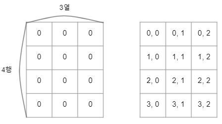 생성 방식 : int[][] num = new int[4][3]; // 4행 3열의 배열 생성