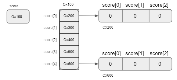 - 배열의 요소(element) : 배열의 각 저장 공간(score[0] ~ score[2])