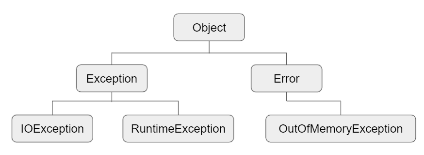 - 예외 : 발생하더라도 수습이 가능한 상태이며 프로그램 코드에 의해 수습될 수 있는 다소 미약한 오류이다.